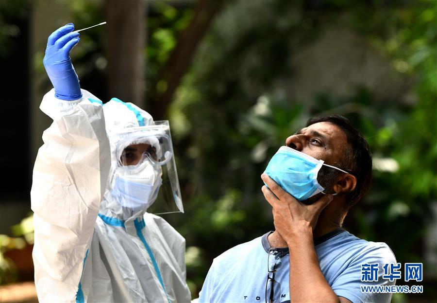 8月2日,一名男子在印度新德里接受新冠病毒检测采样。 印度卫生部2日公布的最新数据显示,该国累计新冠确诊病例1750723例。 新华社发(帕塔·萨卡尔摄)