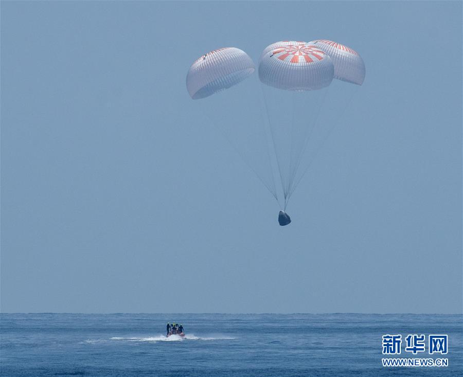 8月2日,太空探索技术公司“龙”飞船准备溅落在美国东南部佛罗里达州附近的墨西哥湾。 搭载两名美国宇航员的美国太空探索技术公司“龙”飞船2日返回地球,溅落在佛罗里达州海岸附近,完成首次载人试飞任务。 新华社发(美国航天局供图)