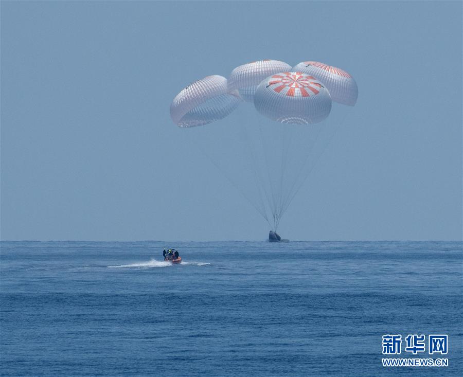8月2日,太空探索技术公司“龙”飞船溅落在美国东南部佛罗里达州附近的墨西哥湾。 搭载两名美国宇航员的美国太空探索技术公司“龙”飞船2日返回地球,溅落在佛罗里达州海岸附近,完成首次载人试飞任务。 新华社发(美国航天局供图)
