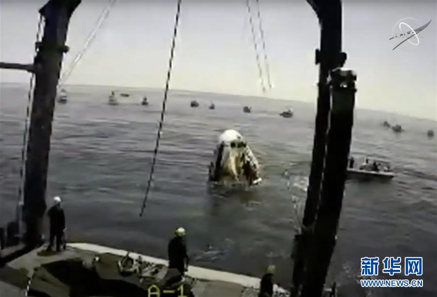 这张美国航天局8月2日发布的视频截图显示,回收船在美国东南部佛罗里达州附近的墨西哥湾打捞太空探索技术公司“龙”飞船。 搭载两名美国宇航员的美国太空探索技术公司“龙”飞船2日返回地球,溅落在佛罗里达州海岸附近,完成首次载人试飞任务。 新华社发(美国航天局供图)