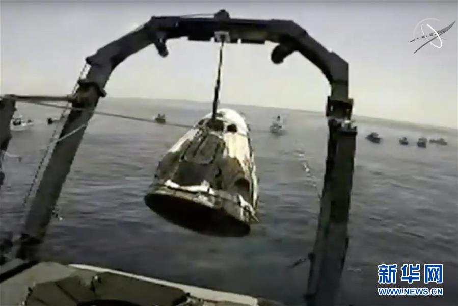 这张美国航天局8月2日发布的视频截图显示,回收船在美国东南部佛罗里达州附近的墨西哥湾打捞太空探索技术公司“龙”飞船。 搭载两名美国宇航员的美国太空探索技术公司“龙”飞船2日返回地球,溅落在佛罗里达州海岸附近,完成首次载人试飞任务。 新华社发(美国航天局供图)