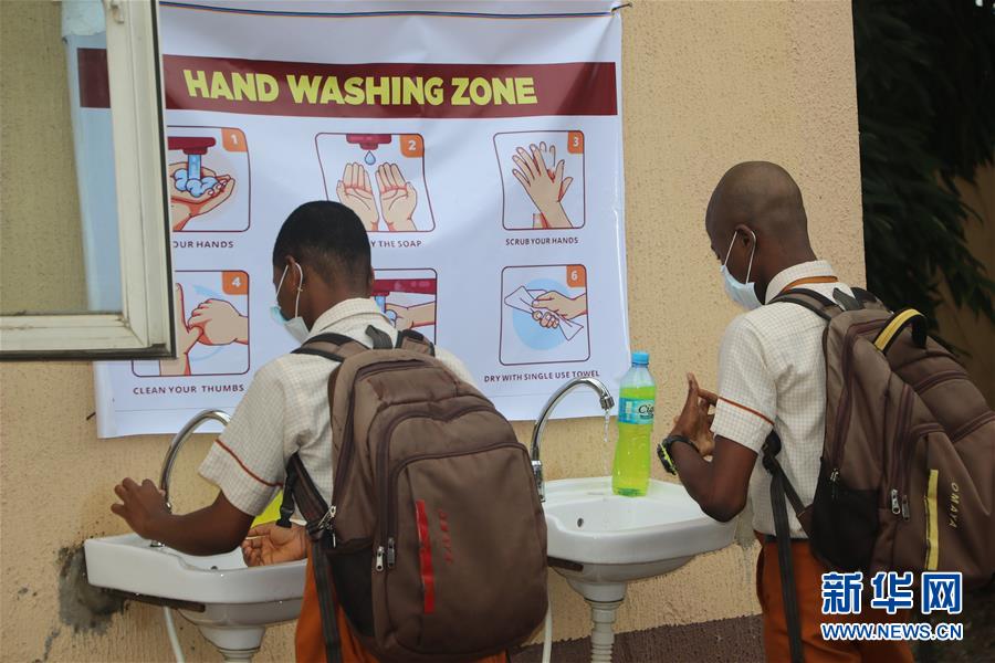 8月3日,尼日利亚经济中心拉各斯的学生在复课返校时洗手。 根据尼日利亚联邦政府有关分阶段放松疫情管控措施的指令,拉各斯州高中三年级和职业技术学校三年级的学生8月3日起率先返校复课,其他年级的学生复课日期待定。 新华社发(埃马纽埃尔·奥索迪 摄)