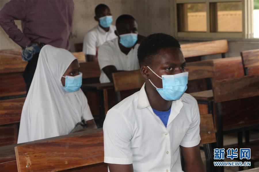 8月3日,尼日利亚经济中心拉各斯的学生佩戴口罩上课。 根据尼日利亚联邦政府有关分阶段放松疫情管控措施的指令,拉各斯州高中三年级和职业技术学校三年级的学生8月3日起率先返校复课,其他年级的学生复课日期待定。 新华社发(埃马纽埃尔·奥索迪 摄)