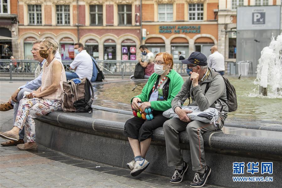 8月3日,人们佩戴口罩坐在法国北部城市里尔市中心一处喷泉旁。 随着复工复产进一步推进,法国疫情近期出现反弹,里尔等城市从3日起强制施行“口罩令”,民众在人行道、公园等部分户外公共场所必须佩戴口罩。 新华社发(塞巴斯蒂安·库尔吉摄)