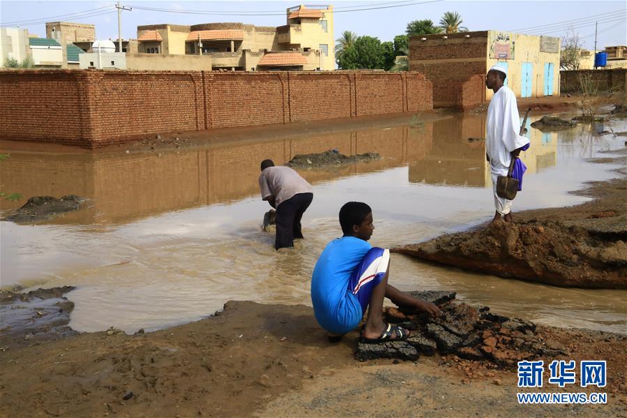 8月3日,人们在苏丹首都喀土穆一处发生洪涝灾害的区域挖开道路泄洪。 苏丹政府3日说,该国连续多日遭受暴雨和洪涝灾害,目前已导致5人死亡、3人受伤。 新华社发(穆罕默德·海德尔 摄)