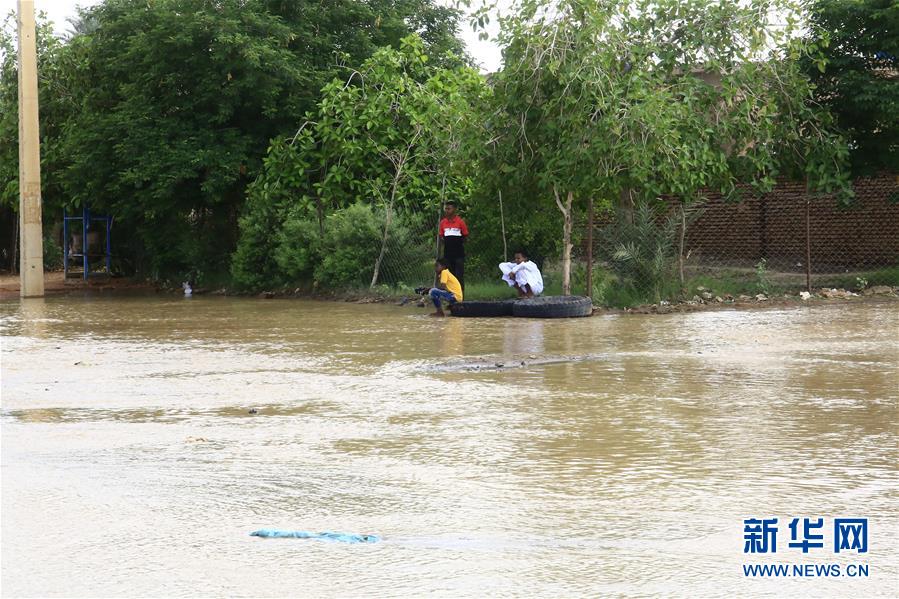 8月3日,人们在苏丹首都喀土穆遭受洪涝灾害的区域望着洪水。 苏丹政府3日说,该国连续多日遭受暴雨和洪涝灾害,目前已导致5人死亡、3人受伤。 新华社发(穆罕默德·海德尔 摄)
