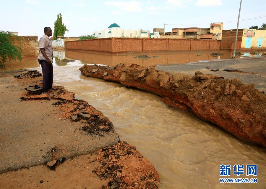 8月3日,一名男子站在苏丹首都喀土穆被挖开的道路旁查看泄洪情况。 苏丹政府3日说,该国连续多日遭受暴雨和洪涝灾害,目前已导致5人死亡、3人受伤。 新华社发(穆罕默德·海德尔 摄)
