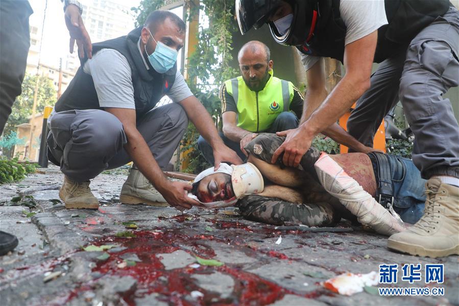 8月4日,在黎巴嫩首都贝鲁特,人们救治一名爆炸中的伤者。 黎巴嫩首都贝鲁特4日傍晚发生爆炸。警方和医务人员说,爆炸至少造成10人死亡,大量建筑物受损。 新华社发(比拉尔·贾维希 摄)