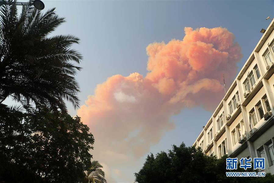 8月4日,黎巴嫩首都贝鲁特发生爆炸后升起粉色浓烟。 黎巴嫩首都贝鲁特4日傍晚发生爆炸。警方和医务人员说,爆炸至少造成10人死亡,大量建筑物受损。 新华社发(比拉尔·贾维希 摄)