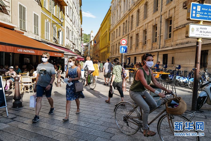 8月4日,人们在法国尼斯市中心佩戴口罩出行。 由于疫情反弹,法国南部海滨城市尼斯自3日起强制民众在部分室外公共场所佩戴口罩。 新华社发(塞尔日·阿乌齐摄)