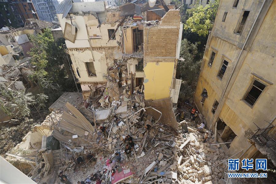 8月5日,军人在黎巴嫩首都贝鲁特爆炸过后的废墟中展开搜救。 黎巴嫩首都贝鲁特港口区4日傍晚发生剧烈爆炸。截至5日晨,爆炸已造成至少100人死亡,另有4000多人受伤。 新华社发(比拉尔·贾维希摄)