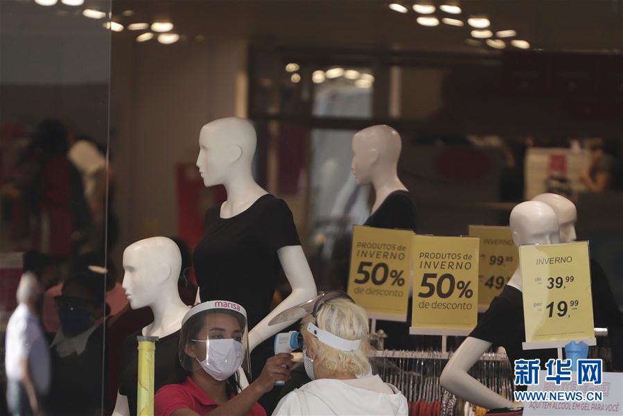 8月5日,市民在巴西圣保罗市一家服装店外接受体温检测。 根据巴西卫生部5日18点40分公布的最新数据,过去24小时巴西新增新冠确诊病例57152例,累计确诊2859073例。 新华社发(拉赫尔·帕特拉索摄)