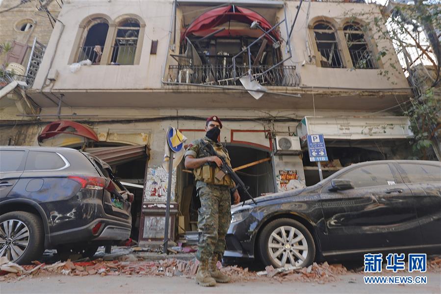 8月5日,士兵在黎巴嫩首都贝鲁特遭爆炸破坏的街区执勤。黎巴嫩政府当天召开紧急会议,宣布贝鲁特为受灾城市,在贝鲁特实施为期两周的紧急状态,由军方监督实施。政府同时敦促有关部门采取措施救助灾民,包括向无家可归者开放学校、酒店等场所,并确保民生物资供应等。新华社发(比拉尔·贾维希摄)