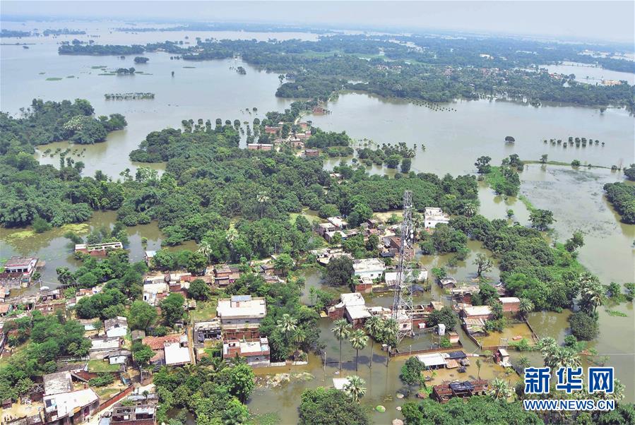这是8月5日航拍的印度比哈尔邦达尔彭加地区洪水泛滥景象。 据印度比哈尔邦灾害管理部门通报,截至4日,比哈尔邦已有636万人受灾。 新华社发