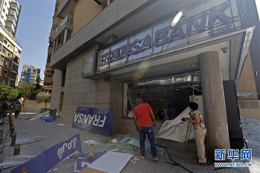 8月6日,在黎巴嫩首都贝鲁特,一家银行清理受损的办公地。 目前,黎巴嫩首都贝鲁特港口区爆炸现场的搜救行动仍在继续,当地民众生活正在逐步恢复中。贝鲁特港口区4日傍晚发生剧烈爆炸,造成大量人员伤亡。 新华社发(比拉尔·贾维希摄)