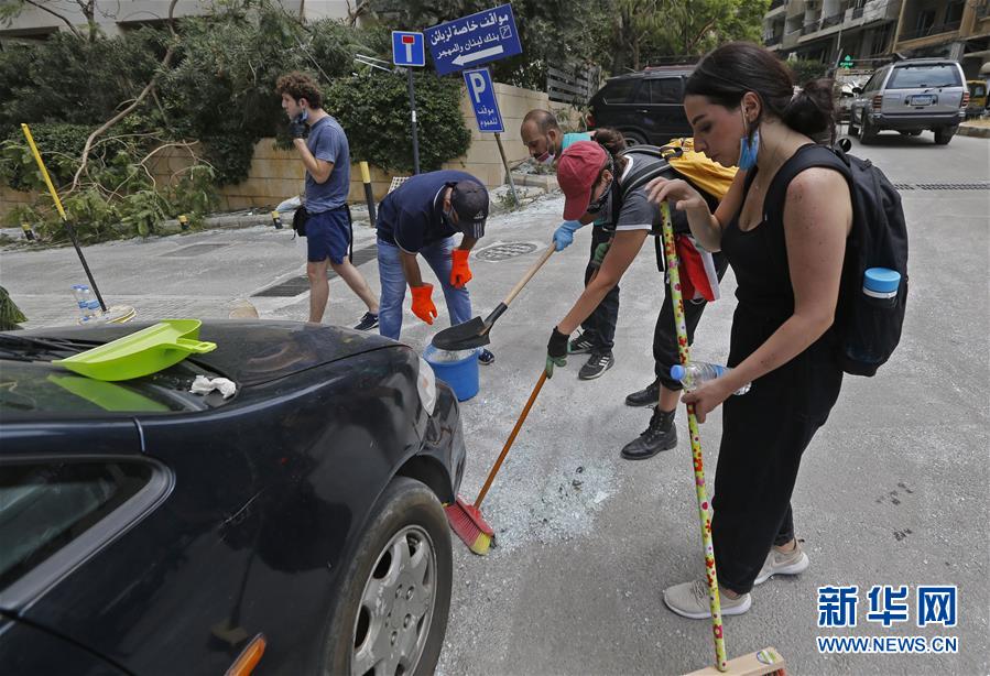 8月6日,在黎巴嫩首都贝鲁特街头,志愿者帮助清理爆炸造成的碎玻璃等。 目前,黎巴嫩首都贝鲁特港口区爆炸现场的搜救行动仍在继续,当地民众生活正在逐步恢复中。贝鲁特港口区4日傍晚发生剧烈爆炸,造成大量人员伤亡。 新华社发(比拉尔·贾维希摄)