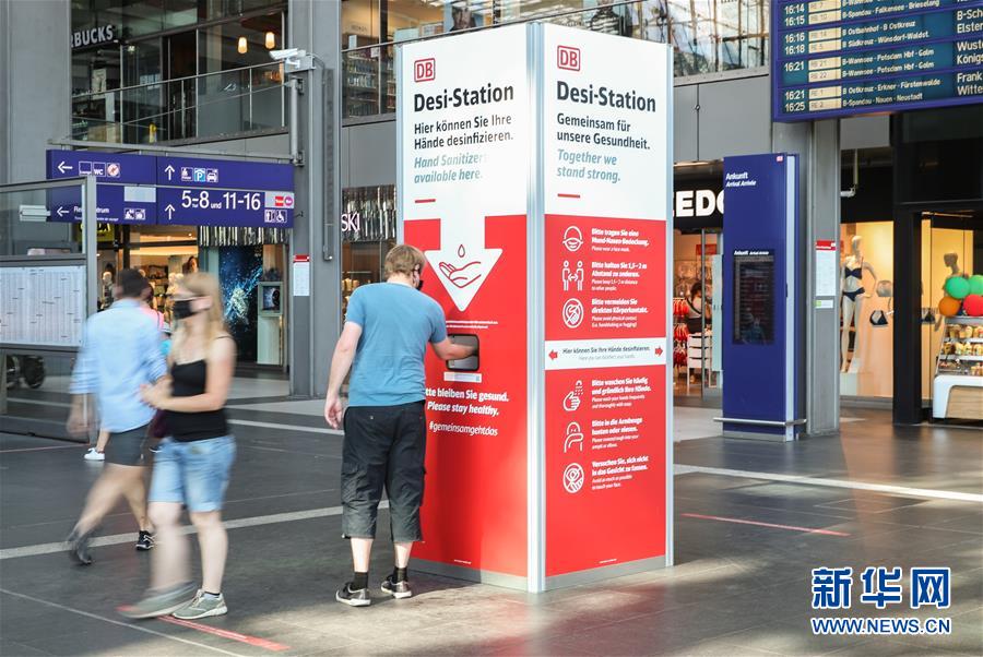 8月6日,在德国柏林主火车站,一名男子使用免洗手消毒设施。 德国疾控机构罗伯特·科赫研究所6日公布的新冠疫情数据显示,截至当地时间6日0时的单日新增确诊病例为1045例,是5月7日以来首次破千。 新华社记者 单宇琦 摄