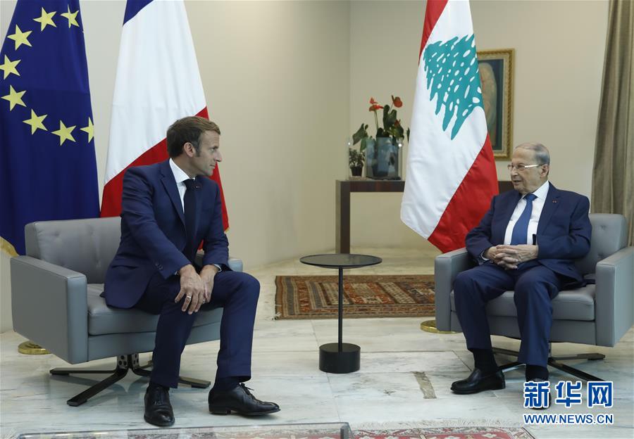 8月6日,在黎巴嫩贝鲁特,黎巴嫩总统米歇尔·奥恩(右)会晤法国总统马克龙。 法国总统马克龙于6日抵达贝鲁特。黎巴嫩与法国政治和经济关系紧密。马克龙在贝鲁特爆炸发生后与黎巴嫩总统奥恩通电话,表示将向黎方提供援助。 新华社发(黎巴嫩官方摄影机构达拉提和努赫拉供图)