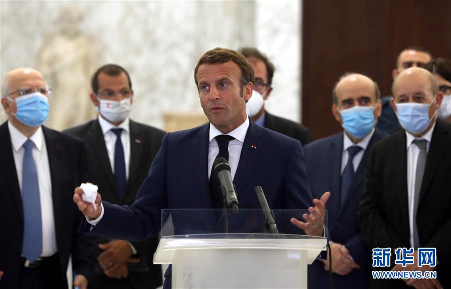 8月6日,在黎巴嫩贝鲁特,到访的法国总统马克龙发表讲话。 法国总统马克龙于6日抵达贝鲁特。黎巴嫩与法国政治和经济关系紧密。马克龙在贝鲁特爆炸发生后与黎巴嫩总统奥恩通电话,表示将向黎方提供援助。 新华社发(黎巴嫩官方摄影机构达拉提和努赫拉供图)