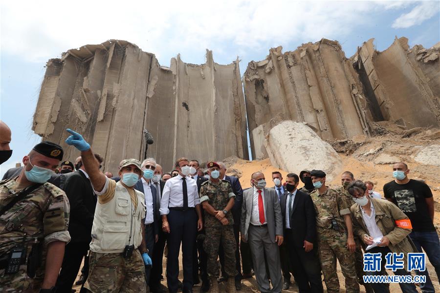 8月6日,法国总统马克龙(前右六)访问爆炸过后的黎巴嫩贝鲁特港口。 法国总统马克龙于6日抵达贝鲁特。黎巴嫩与法国政治和经济关系紧密。马克龙在贝鲁特爆炸发生后与黎巴嫩总统奥恩通电话,表示将向黎方提供援助。 新华社发(黎巴嫩官方摄影机构达拉提和努赫拉供图)