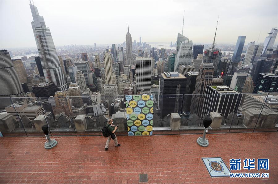 8月6日,在美国纽约,一名摄影师在洛克菲勒中心观景台上参观。 当日,3月份暂时关闭的洛克菲勒中心观景台恢复对公众开放。每天13时至21时,人们可戴口罩前往参观。 新华社记者王迎摄