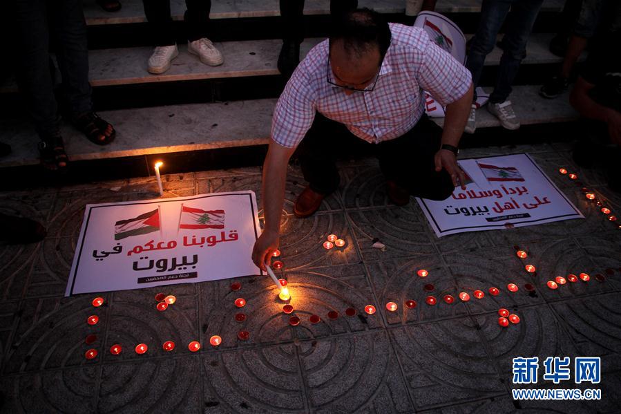 8月6日,一名巴勒斯坦男子在加沙城点燃蜡烛,表达对黎巴嫩民众的支持。 新华社发(里泽克摄)