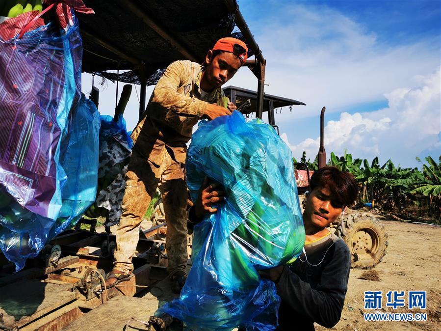 7月16日,在柬埔寨桔井省的柬埔寨—中国热带生态农业合作示范区内,工人搬运刚刚收获的香蕉(手机拍摄)。新华社记者毛鹏飞摄