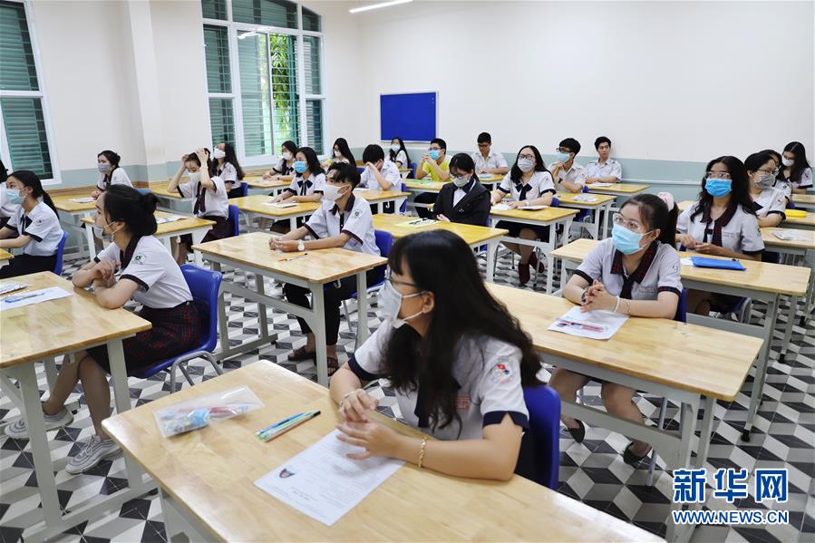 8月9日,在越南南部胡志明市,佩戴口罩的考生们参加考试。 2020年越南国家高中毕业和大学入学统一考试9日在疫情下拉开帷幕,全国86万余名考生参加。 新华社/越通社