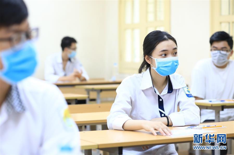 8月9日,在越南首都河内,佩戴口罩的考生们参加考试。 2020年越南国家高中毕业和大学入学统一考试9日在疫情下拉开帷幕,全国86万余名考生参加。 新华社/越通社