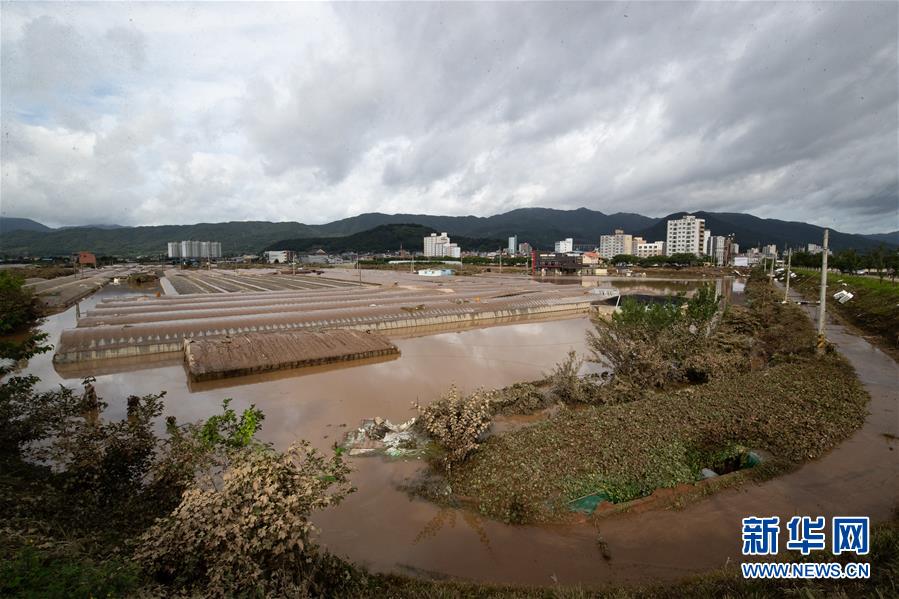 8月9日,在韩国全罗南道求礼郡,一大片农田被淹。 由于首都圈和中部地区连日遭受暴雨袭击,韩国自8月1日至9日因暴雨导致的死亡人数累计已达30人,另有12人失踪、8人受伤。 新华社发(李相浩 摄)