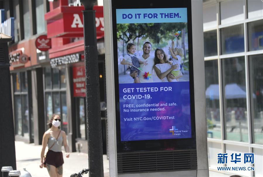 8月9日,美国纽约街头的信息屏提示人们进行新冠检测。 新华社记者王迎摄