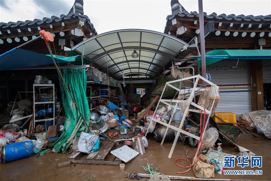 8月9日,在韩国全罗南道求礼郡,某市场暴雨过后一片狼藉。 由于首都圈和中部地区连日遭受暴雨袭击,韩国自8月1日至9日因暴雨导致的死亡人数累计已达30人,另有12人失踪、8人受伤。 新华社发(李相浩 摄)
