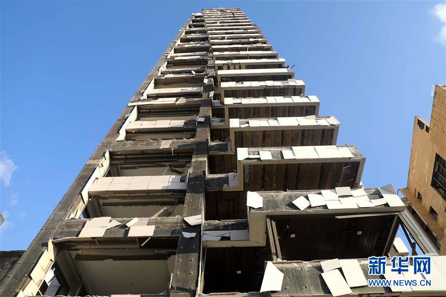 8月9日,在黎巴嫩首都贝鲁特,临近贝鲁特港口区爆炸现场的一幢大楼受损严重。 黎巴嫩军方9日说,黎巴嫩首都贝鲁特港口区爆炸现场的搜救行动仍在继续,但找到生还者的希望越来越渺茫。 新华社发(比拉尔·贾维希摄)