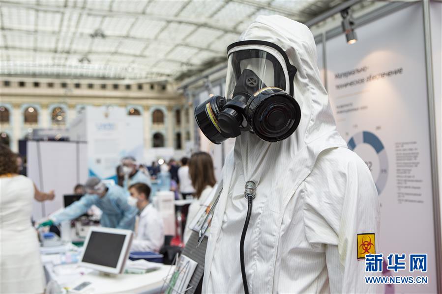 这是8月11日在俄罗斯首都莫斯科举行的“国民健康——俄罗斯繁盛之基”论坛上拍摄的防护设备。 当日,“国民健康——俄罗斯繁盛之基”论坛在莫斯科开幕,今年论坛的中心议题是在新挑战下如何保护和加强俄罗斯民众的健康。 新华社发(亚历山大摄)