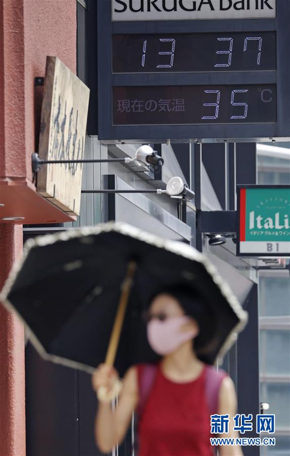 8月10日,在日本东京日本桥地区,撑遮阳伞出行的行人经过一处显示气温的电子屏。 新华社/共同社
