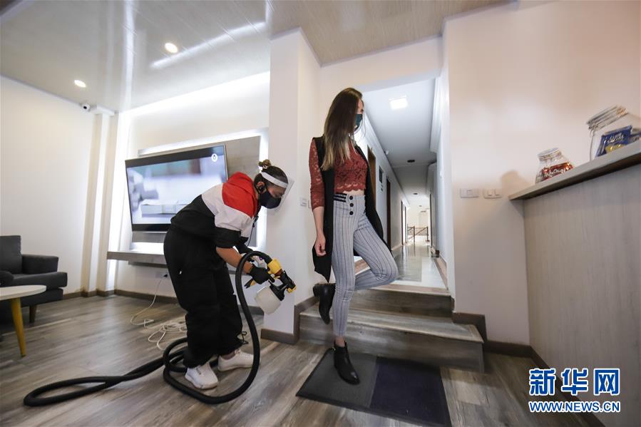 8月6日,在哥伦比亚首都波哥大未来胶囊旅店,工作人员对入住客人的鞋底喷洒消毒液。 哥伦比亚首都波哥大这家胶囊旅店在严格遵守政府防疫规定的前提下营业,对店内设施进行定期消毒,控制入住旅客人数,对旅客体温进行测量。 新华社发(约翰·帕斯摄)