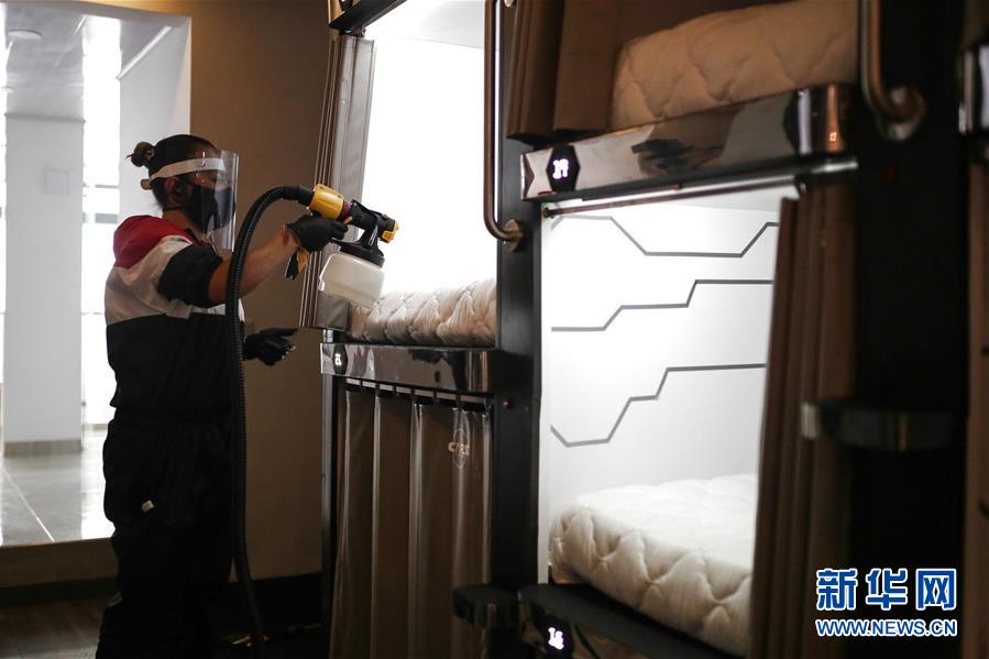 8月6日,哥伦比亚首都波哥大未来胶囊旅店的工作人员进行例行消毒。 哥伦比亚首都波哥大这家胶囊旅店在严格遵守政府防疫规定的前提下营业,对店内设施进行定期消毒,控制入住旅客人数,对旅客体温进行测量。 新华社发(约翰·帕斯摄)