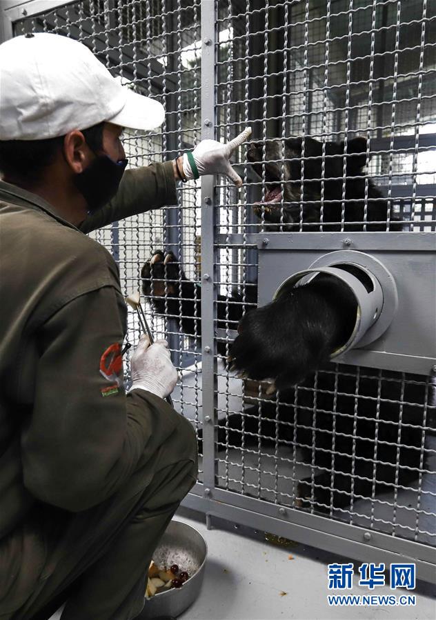 8月12日,在哥伦比亚托坎西帕,海梅·杜克生态动物园的工作人员给南美洲特有的眼镜熊喂食。 海梅·杜克生态动物园受新冠疫情影响已关闭数月。由于缺乏门票收入,这座动物园在社会团体和爱心人士的帮助下勉强维持运营。 新华社发(约翰·帕斯摄)
