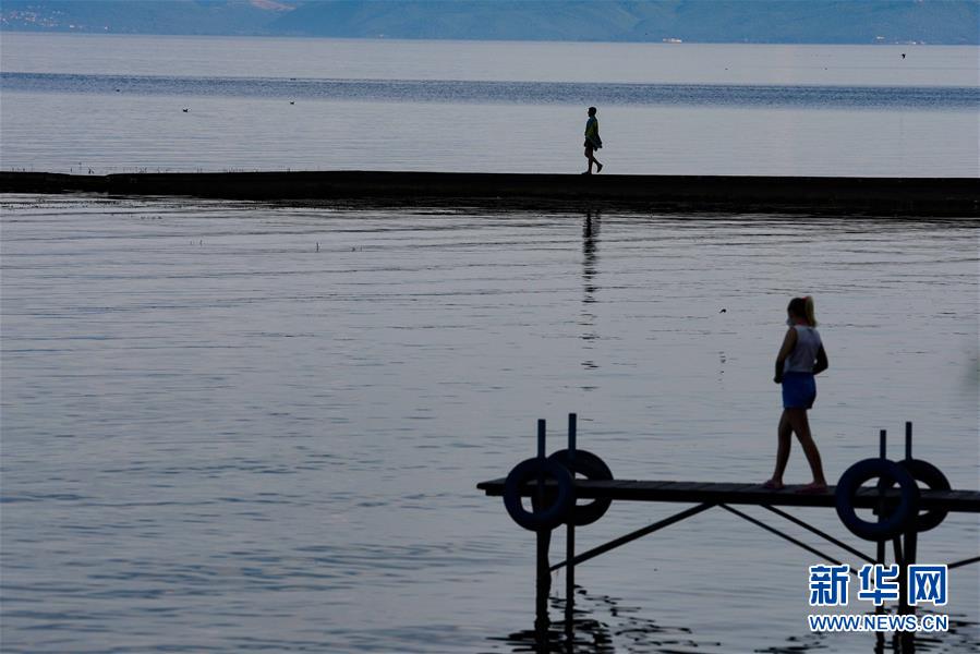 8月13日,人们在北马其顿斯特鲁加镇奥赫里德湖一码头游玩。 据北马其顿国家统计局8月12日公布的数据,受新冠疫情影响,与去年同期相比,今年6月北马其顿游客量下降了95.6%。 新华社发(托米斯拉夫·格奥尔基耶夫摄)