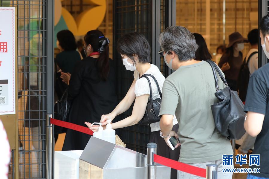 8月15日,在日本东京银座,顾客在进入商场前使用消毒液。 新华社记者 杜潇逸 摄