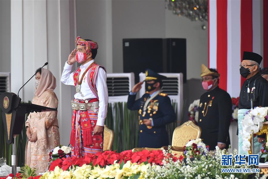 8月17日,印度尼西亚雅加达,总统佐科(左二)出席为庆祝独立日而举行的升国旗仪式。 8月17日是印度尼西亚独立日。 新华社发(印尼总统府供图)