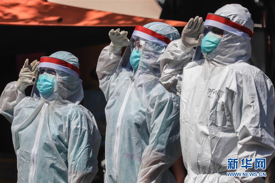 8月17日,医护人员身着防护服在印度尼西亚泗水一家临时医院举行的升国旗仪式上敬礼。 8月17日是印度尼西亚独立日。 新华社发(苏里亚·贝塔摄)