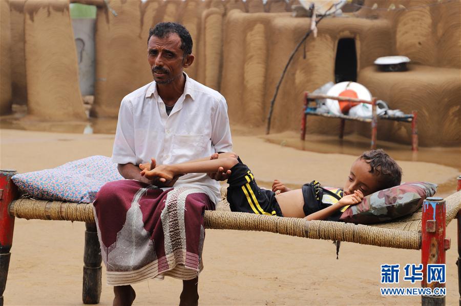 8月14日,在也门哈杰省一处村庄,一位父亲照料患有急性营养不良和脑积水的孩子。 新华社发(穆罕默德摄)
