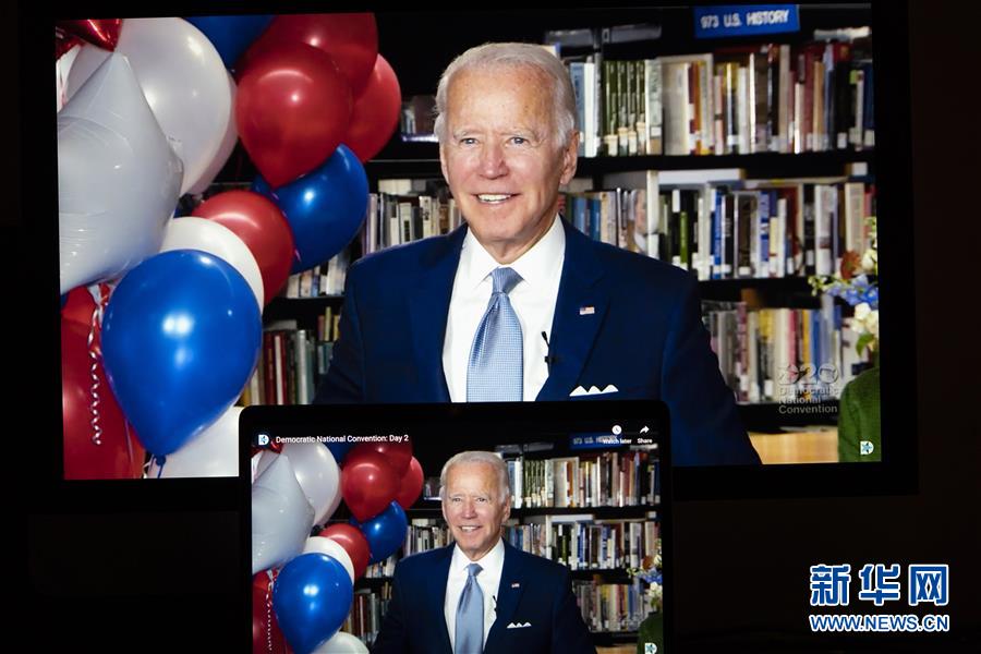 这张8月18日拍摄的直播视频画面显示,乔·拜登被提名为2020年美国民主党总统候选人后庆祝。 美国民主党全国代表大会美国东部时间18日晚正式提名前副总统乔·拜登为2020年民主党总统候选人,他将与谋求连任的美国总统特朗普展开角逐。 新华社记者 刘杰 摄