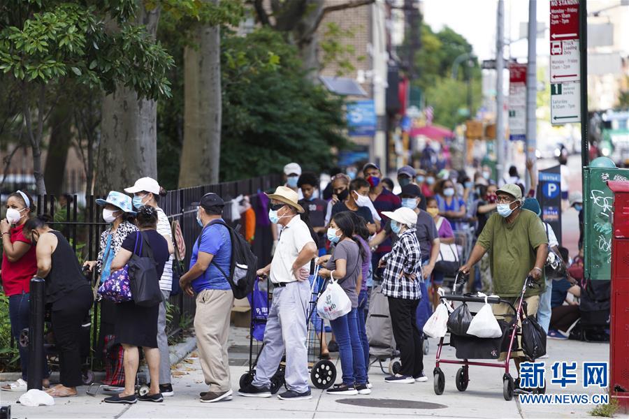 8月18日,人们在美国纽约排队领取免费发放的食品。 新华社记者 王迎 摄