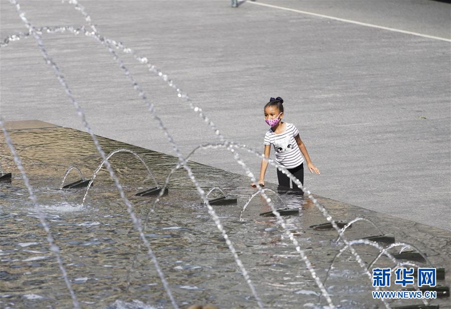8月18日,一名女孩在美国纽约一处水池边玩水。 美国约翰斯·霍普金斯大学发布的新冠疫情统计数据显示,截至美国东部时间18日21时27分(北京时间19日9时27分),美国累计新冠确诊病例达5481557例。 新华社记者 王迎 摄