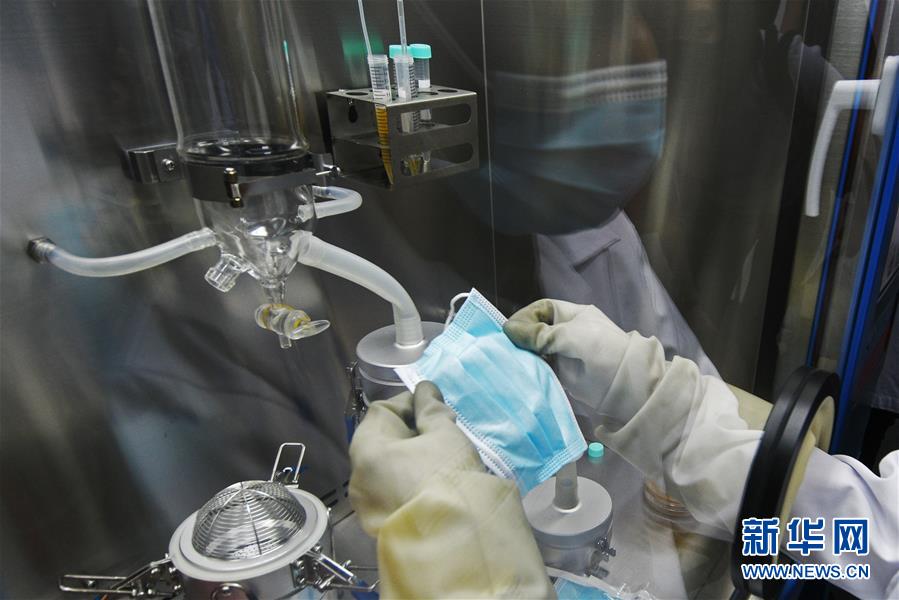 8月18日,新加坡实科检测公司的工作人员在实验室里对外科口罩进行细菌过滤效率检测。 新加坡实科检测公司提供ASTM标准(美国材料实验协会标准)的外科口罩检测服务,对口罩质量进行把关。 新华社发(邓智炜摄)