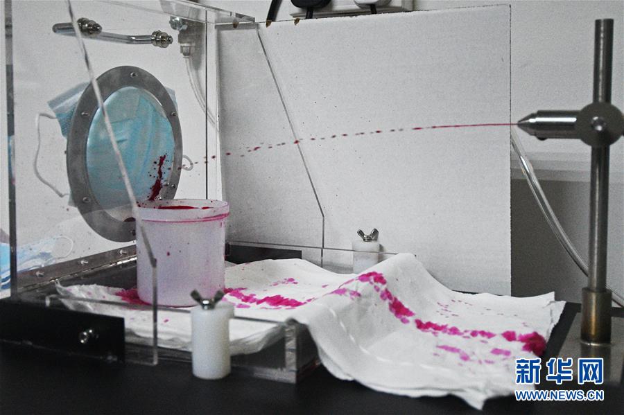 8月18日,新加坡实科检测公司的工作人员在实验室里对外科口罩进行合成血液穿透测试。 新加坡实科检测公司提供ASTM标准(美国材料实验协会标准)的外科口罩检测服务,对口罩质量进行把关。 新华社发(邓智炜摄)