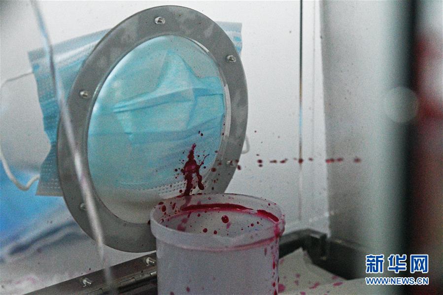8月18日,新加坡实科检测公司的工作人员在实验室里对外科口罩进行合成血液穿透测试。 新加坡实科检测公司提供ASTM标准(美国材料实验协会标准)的外科口罩检测服务,对口罩质量进行把关。 新华社发(邓智炜摄)