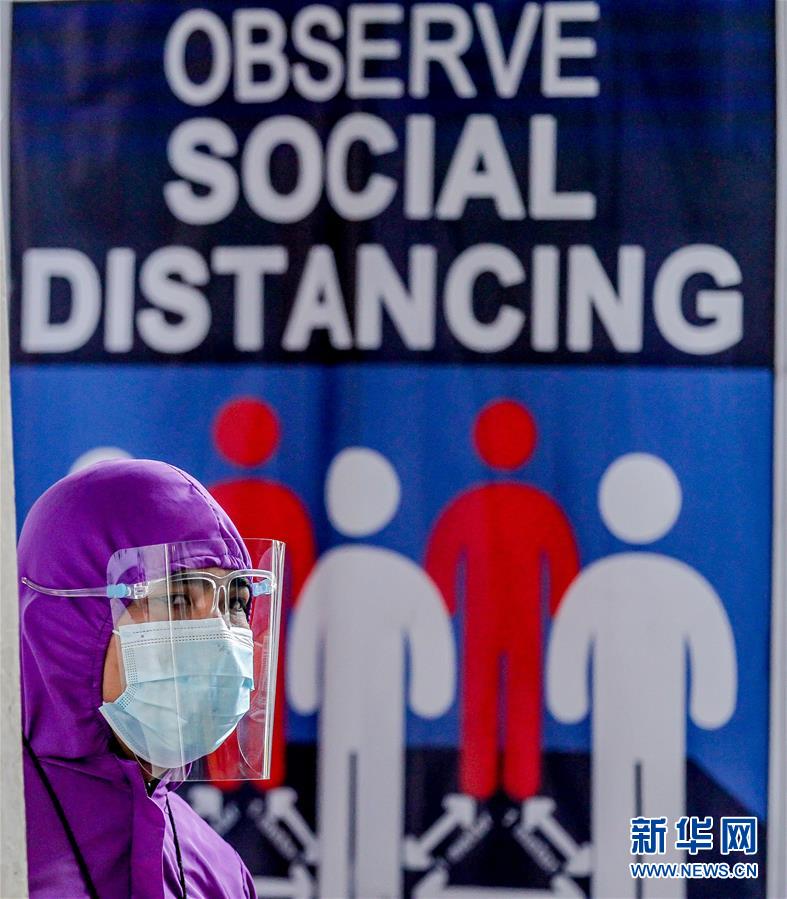 8月19日,菲律宾大马尼拉都市区一处地铁站内的安保人员站在“保持社交距离”的防疫标语前。 菲律宾卫生部19日通报,该国累计新冠确诊病例达到173774例。 新华社发(乌马利摄)